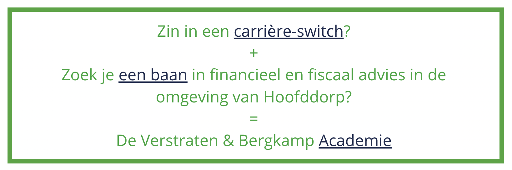 Jij wilt een nieuwe richting in en daarbij gecoacht worden. Op basis van de eerste ervaringen wil je een opleidingsplan hebben dat jou gaat helpen in een nieuwe baan te groeien. Daar kunnen cursussen, trainingen en workshops bij horen en ook intervisie en coaching. Wil je de zaken nog ambitieuzer invullen? Dan behoort een HBO opleiding of Universitaire studie ook tot de mogelijkheden. Je wilt deel uitmaken van de Verstraten & Bergkamp Academie.